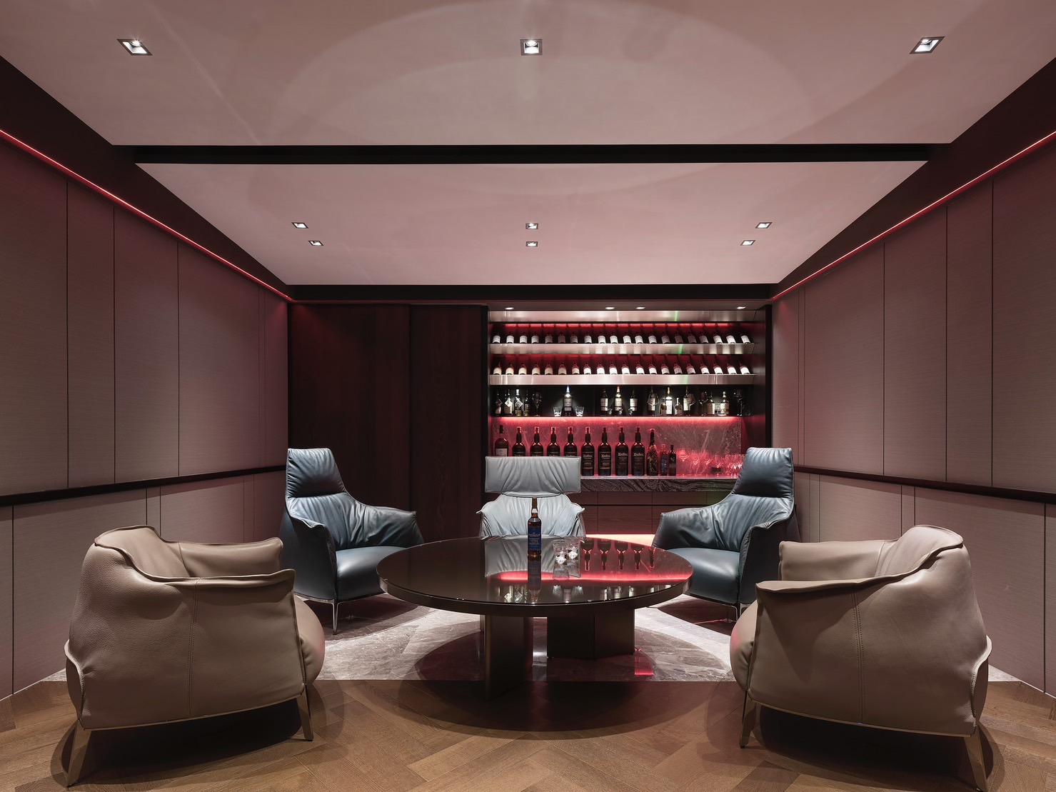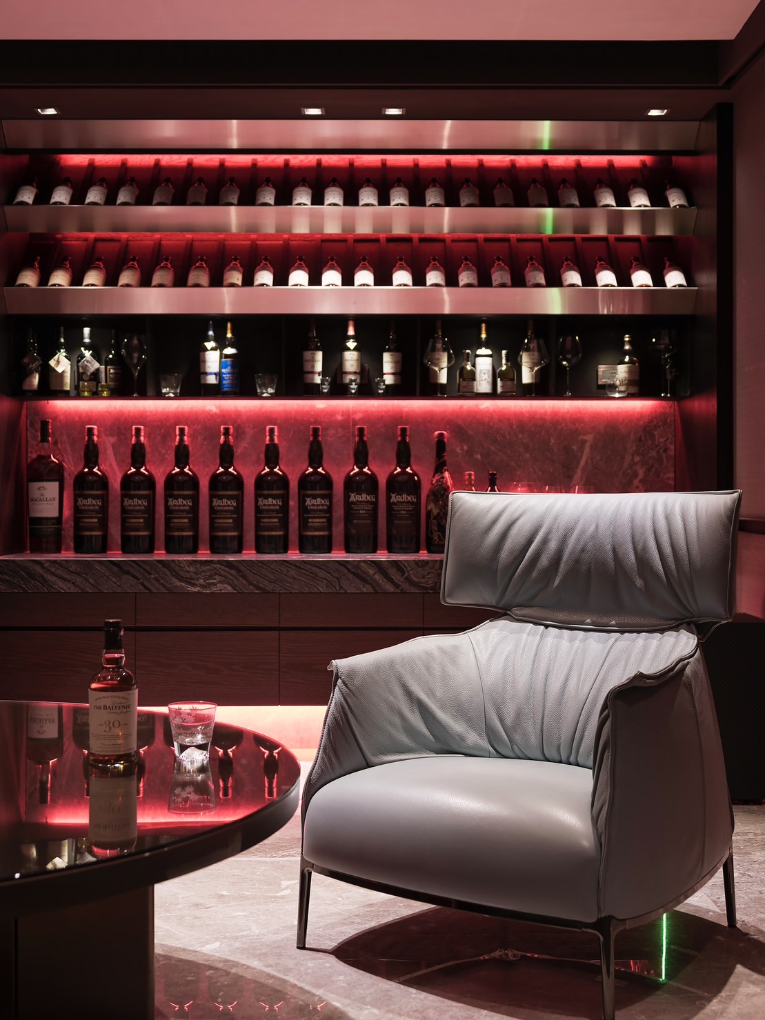 在酒櫃和牆面上加入了優質的燈條,能夠提供柔和而溫暖的燈光效果,營造出舒適的酒品欣赏氛圍。