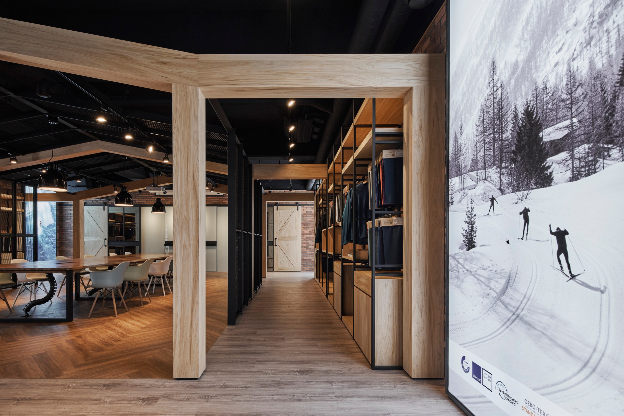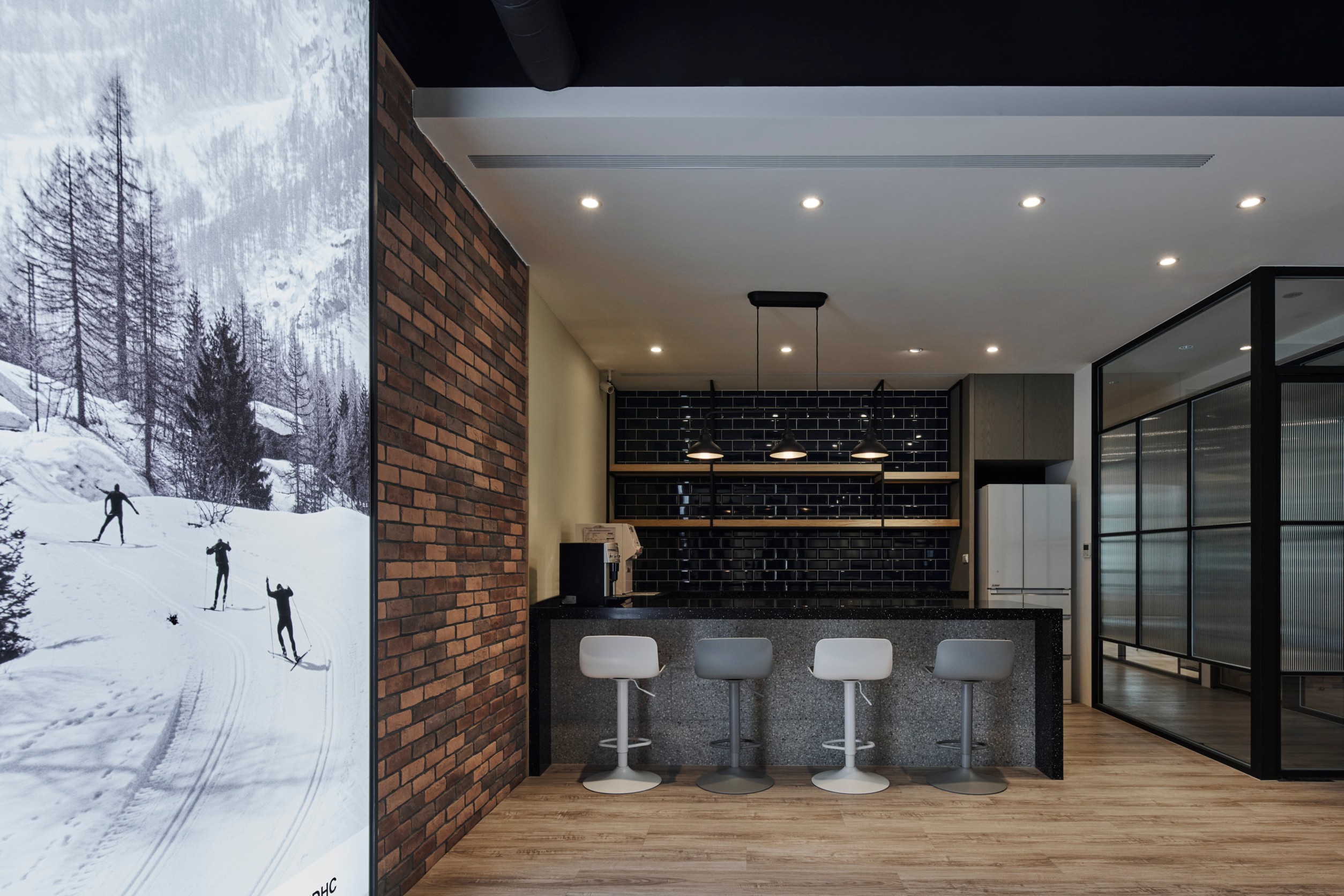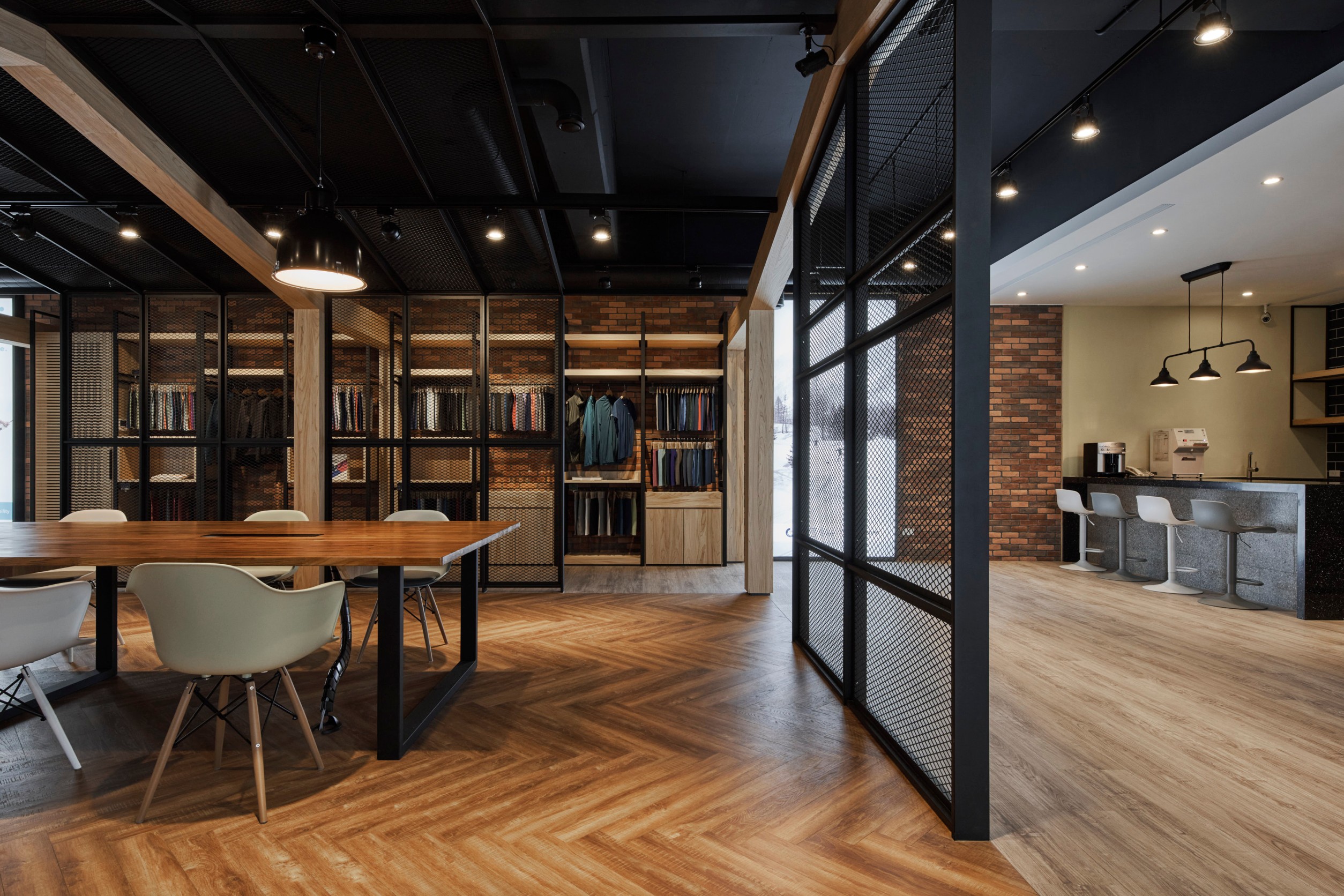 裸露的磚牆、金屬結構和原木元素融合在一起,呈現出質樸、堅固和精緻的視覺效果。這些元素營造出一種工業時代的氛圍,同時展現出現代設計的時尚感。